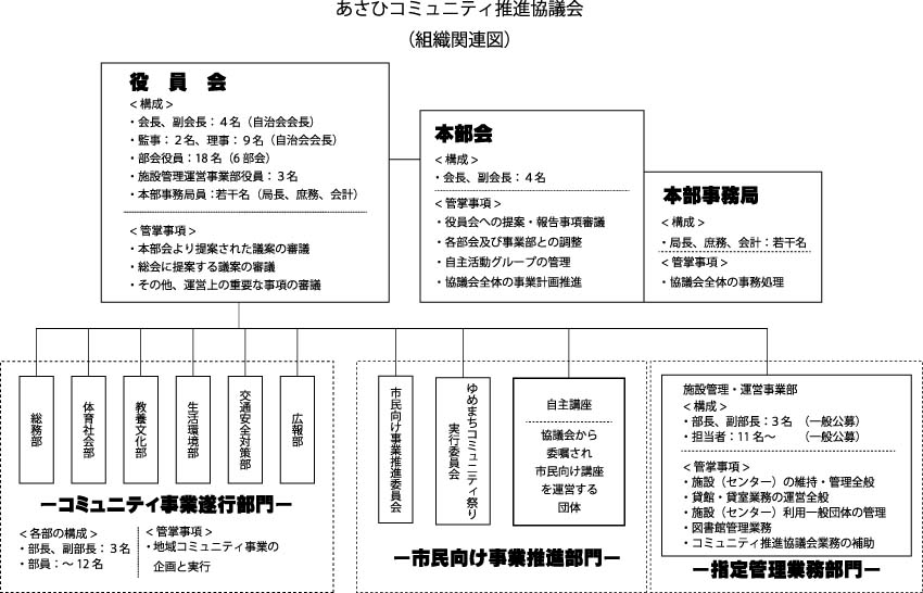 役員は、理事(15自治会長)と各部会、事業部の代表者で構成されます。 |
